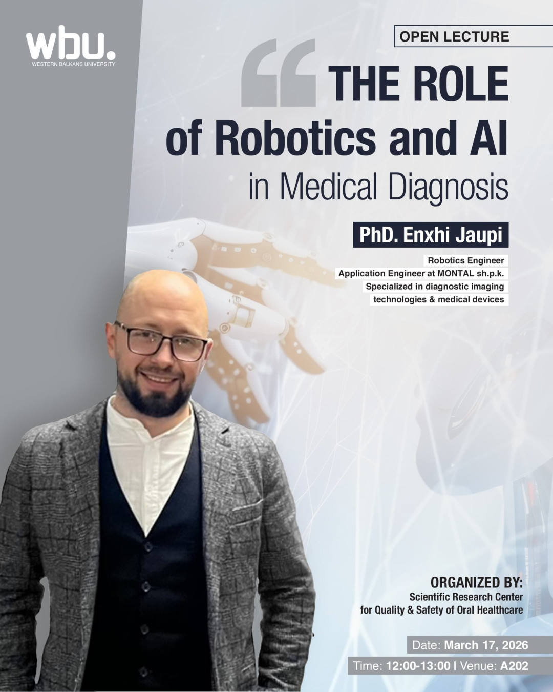 The lecture will feature Dr. Enxhi Japupi, Robotics Engineer at MONTAL sh.p.k., specializing in diagnostic imaging technologies and medical devices.