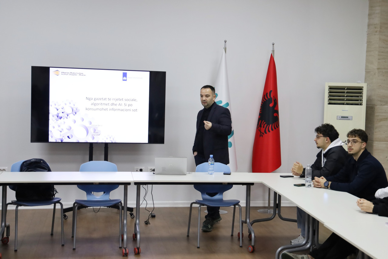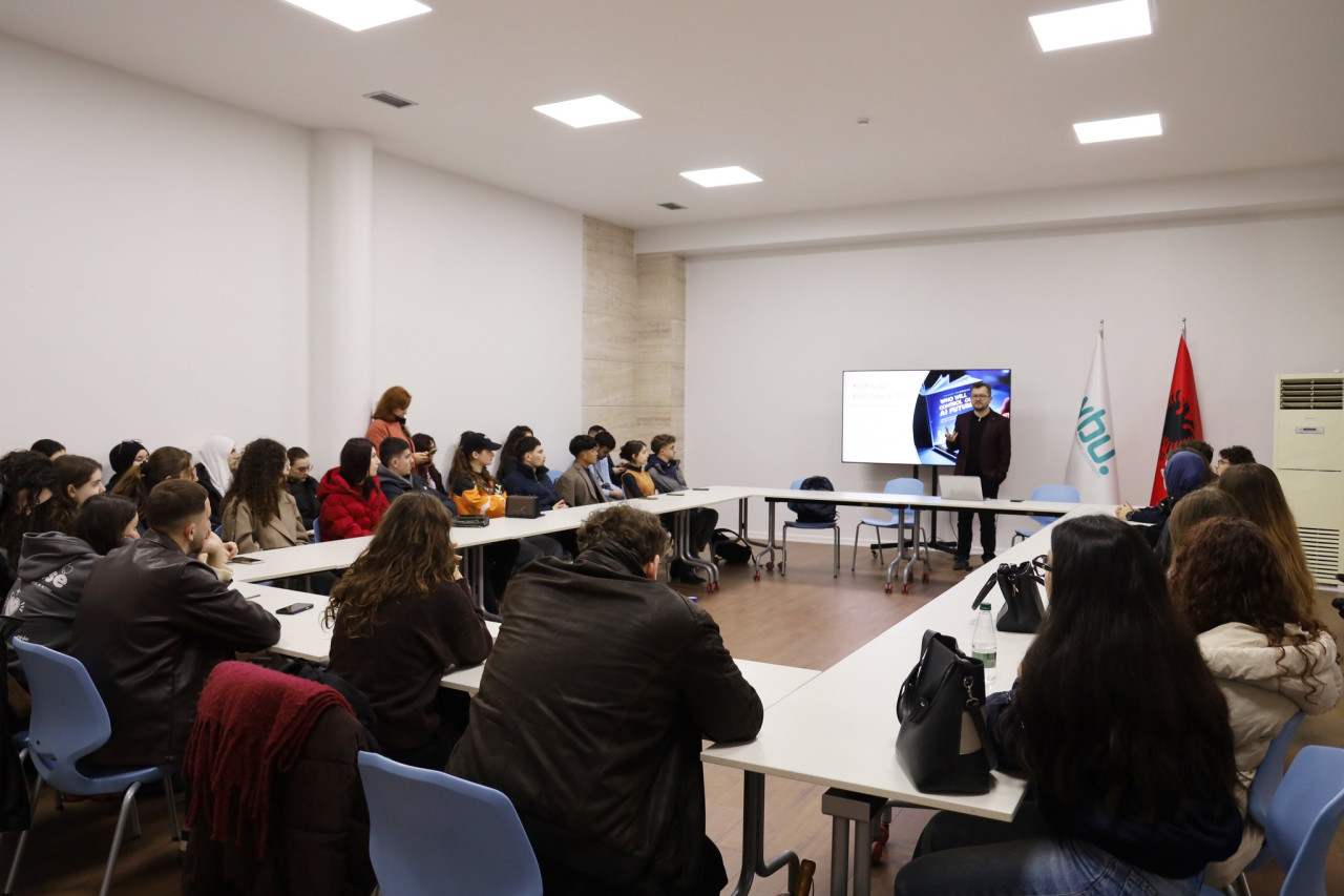 Students from various academic programs attended the session, with presentations delivered by Mr. Emirjon Senja, a media expert and head of Skyweb.al, and Prof. Erlis Çela.