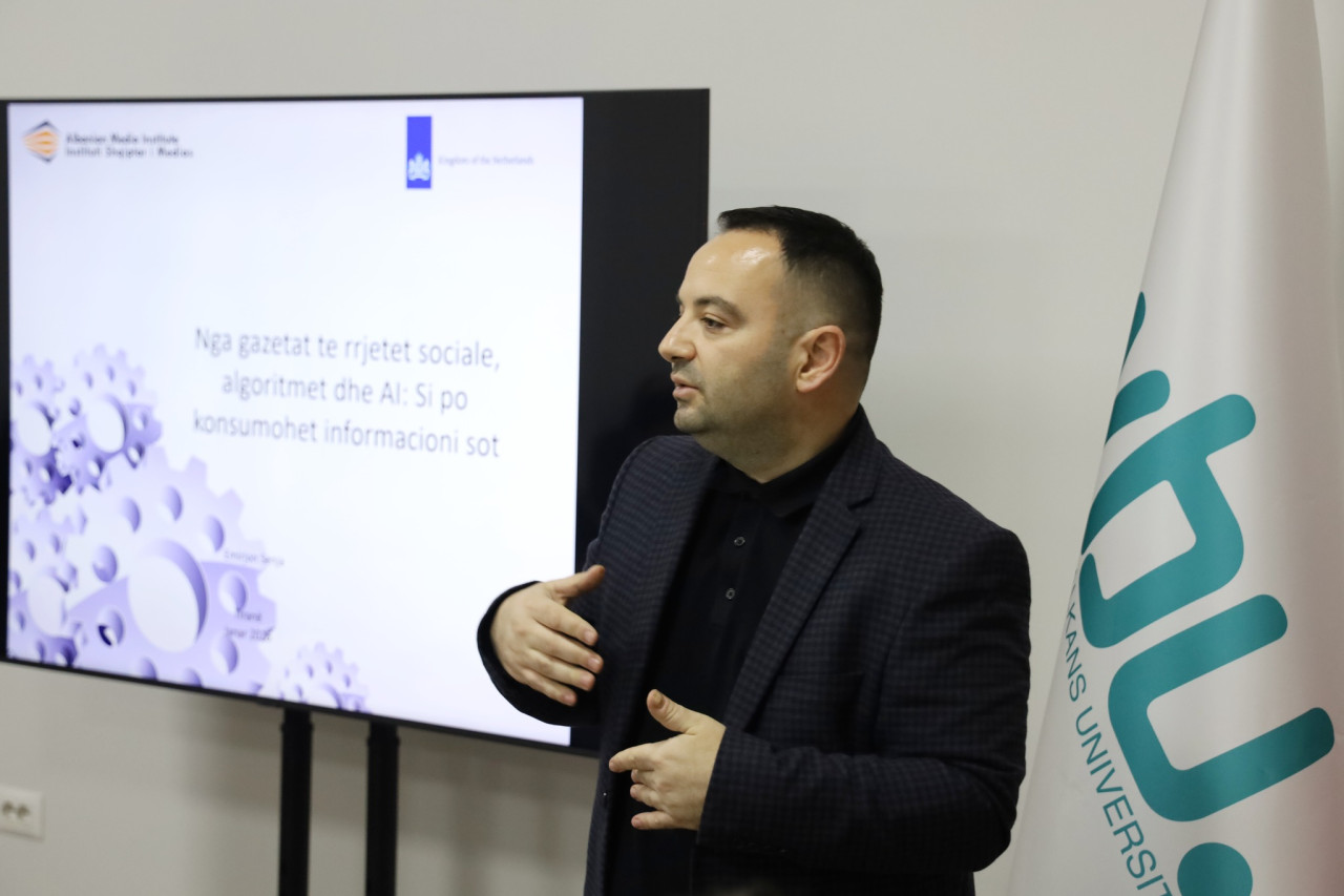 During the session, Prof. Çela focused on the role of artificial intelligence and its connection to the spread of misinformation, emphasizing ethical challenges and the need for continuous information verification. In parallel, Mr. Senja addressed the influence of social media and algorithms on how information is consumed today, as well as the rapid transformation of public media habits.